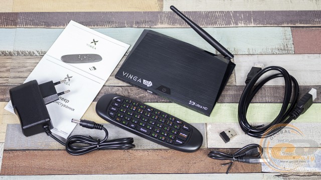 У коробці, крім самого пристрою, ми виявили коротку інструкцію, блок живлення, кабель micro-HDMI ↔ HDMI, пульт ДУ з USB-приймачем і кабелем зарядки.