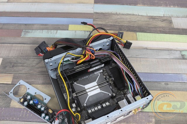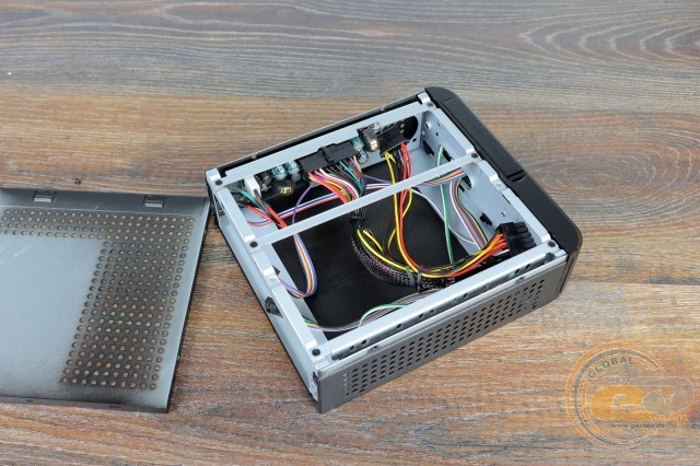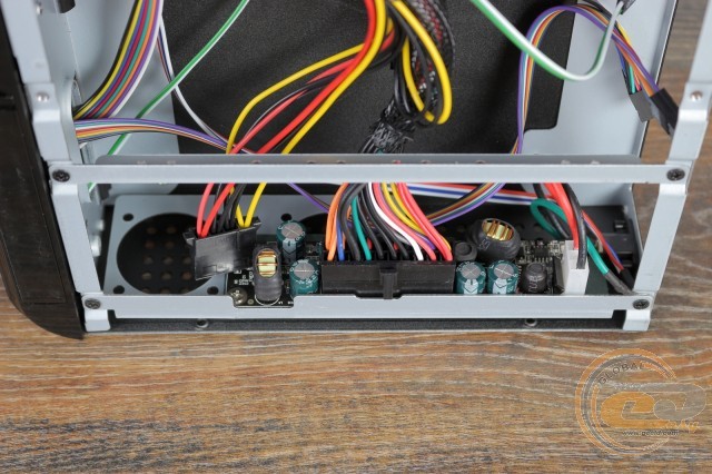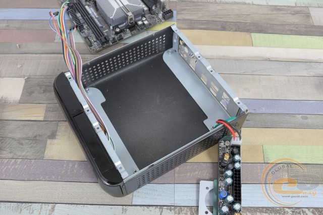 Корпус підтримує встановлення материнських плат форм-фактора Mini-ITX. Але в нашому разі виникли складності. Тестова ECS Z97I-DRONE просто впиралася 24-контактним роз'ємом у навісний перетворювач живлення. Тому в більшості випадків встановити материнську плату у якій 24-контактний роз'єм розпаяний збоку від інтерфейсної панелі буде неможливо.