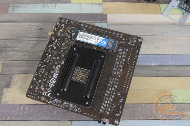 Але ми і тут викрутилися, використавши твердотельнік WD Blue (WDS250G2B0B) формату M.2 2280. Благо, плата це дозволяє, оскільки має роз'єм M.2 Socket 3 із зворотного боку. Відстань ж від друкованої плати материнки до верхньої кришки корпуса становить 50 мм. Тобто наш боксовий кулер помістився якраз по висоті з міліметровим зазором.