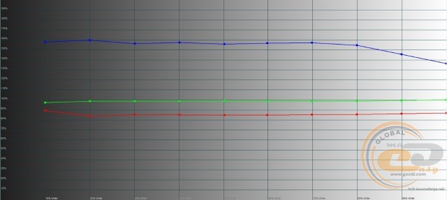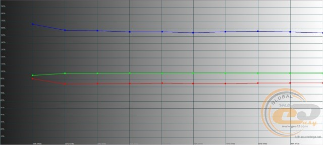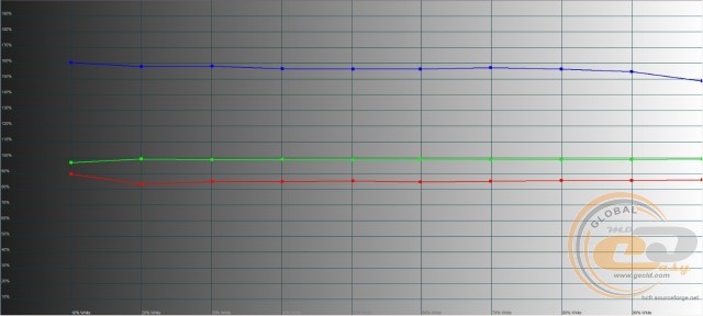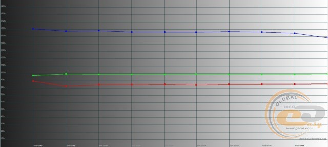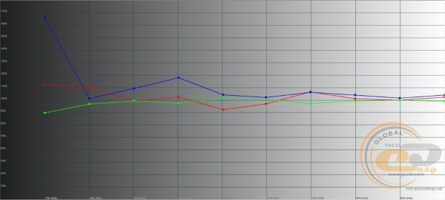 Дуже часто в моніторах і телевізорах завищують синю складову, щоб картинка на екрані виглядала більш холодною для ефектного відображення води, льоду, неба і т.д. Тут спостерігається той же підхід: ідеальне налаштування зеленої складової, злегка занижена червона (80% - 90%) і суттєво завищена синя (130% - 170%).