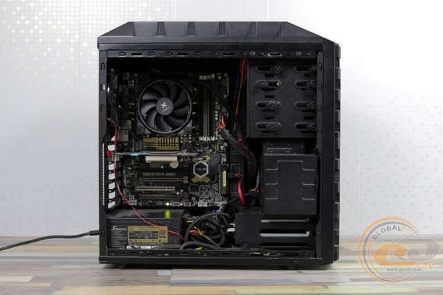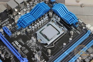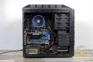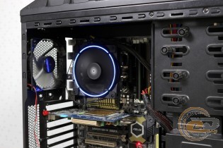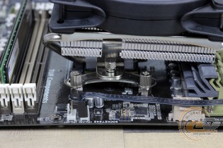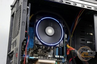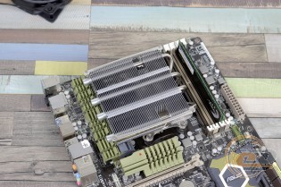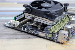 Якщо розмістити кулер так, як показано на фото, тоді сумісність із пам'яттю вас порадує. У всі слоти при бажанні можна встановити навіть оверклокерські модулі. Хоча сам радіатор розмістився впритул до околосокетного охолоджувача: якби вони трохи вищі, довелося б думати про їх демонтаж. Також при накритті охолоджувачем зони портів введення-виведення буде потрібно зняти тильний корпусний пропелер.