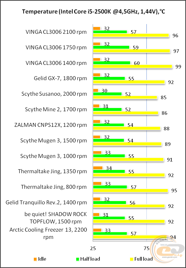 Продуктивності Vinga CL3006 впритул, але все ж вистачає для відводу тепла від розігнаного до 4,5 ГГц Intel Core i5-2500K. Порівняно компактна конструкція дає про себе знати, і навіть висока частота обертання вентилятора в 2100 об/хв дозволяє відіграти лише пару-трійку градусів. Але в цілому новинку можна використовувати на процесорах з розгінним потенціалом. Ось тільки розкрити його повністю не вийде, тим більше всередині компактного корпуса.
