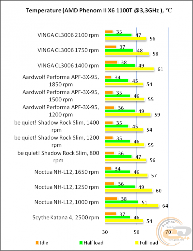 А ось гарячий норов 125-ватного AMD Phenom II X6 1100T змусив нас обійтися без розгону. Отримані температурні показники дещо вищі від компактних «веж», але головне - ефективність новинки навіть при мінімальній частоті обертання більш ніж достатньо для виконання свого завдання.