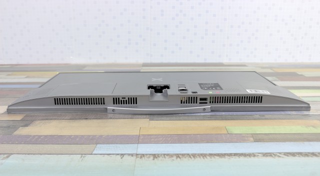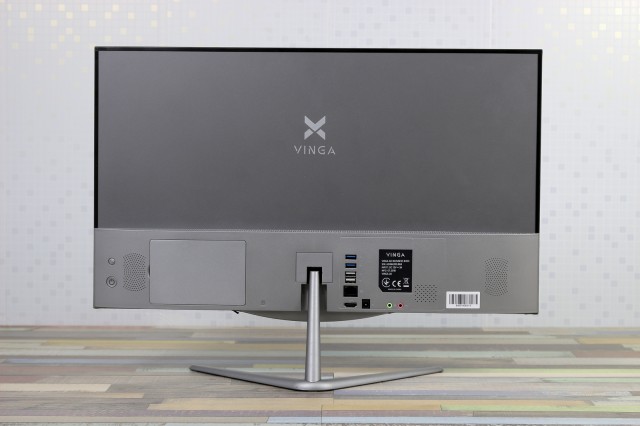 Тильна частина Vinga AIO BUSINESS B400 в основному дуже тонка, але знизу вона потовщується за рахунок апаратної платформи. Тут же зосереджені всі елементи управління і порти введення-виведення.