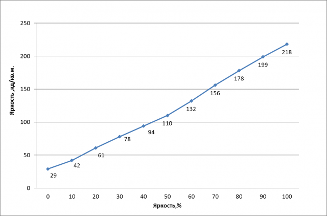 Яскравість змінюється в діапазоні від 29 до 218 кд/м2. Це дозволить комфортно працювати в приміщенні вночі або вдень. Але під прямими сонячними променями можуть виникати проблеми з читаністю інформації, чому також не сприяє глянсове покриття.