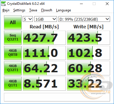 На скріншоті вище видно, що навіть з давнім твердотельником ADATA SD700 (ASD700-256GU3-CYL) можна розраховувати на хороші швидкісні показники: читання - до 428 МБ/с, а запис - 423,5 МБ/с.