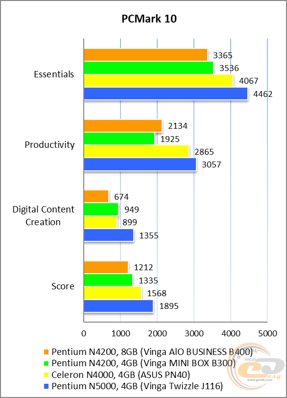 Щоб більше оцінити рівень продуктивності Vinga AIO BUSINESS B400 (A24N4200.864), ми зіставили його результати з раніше протестованими міні-ПК ASUS Mini PC PN40 і Vinga Mini BOX B300 на базі процесорів Intel Celeron N4000 і Intel Pentium N4200, а також з ноутбуком Vinga Twizzle J116 на базі процесора Intel Pentium Silver N5000.