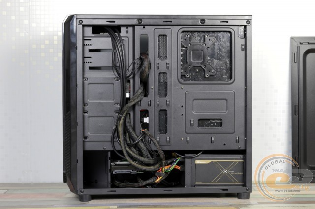 Вільний простір за піддоном дозволить домогтися належної естетичності, навіть якщо використовується недорогий БЖ з немодульною системою підключення кабелів. Штампування на правій боковині цьому лише сприяє.