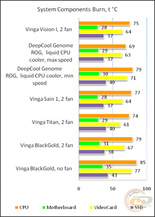 Встановлення двох вентиляторів дозволить створити на основі Vinga Vision I справжню ігрову систему, без ризику перегрівання комплектуючих. Якщо ж обійтися без додаткових пропелерів, температура компонентів буде близькою до значень Vinga BlackGold у самому низу діаграм. Тобто без перегрівання, проте з великим шумовим фоном через додаткове навантаження на системи охолодження процесора та відеокарти. При цьому врахуйте, що такі показники були отримані в приміщенні з температурою + 27,5° C. Тому в прохолодніших умовах можна очікувати ще нижчі температурні значення.