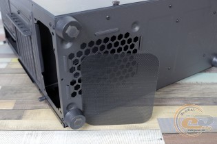 Для очищення повітря, що надходить до БЖ, є знімний пиловий фільтр, розміщений на нижній панелі. В її кутках є пластикові круглі ніжки з висотою 18 мм з міліметровими гумовими прокладками, покликаними захистити поверхню та звести до мінімуму ковзання системника. Загалом показник прийнятний, хоча ставити корпус на ворсистий килим ми б не радили.