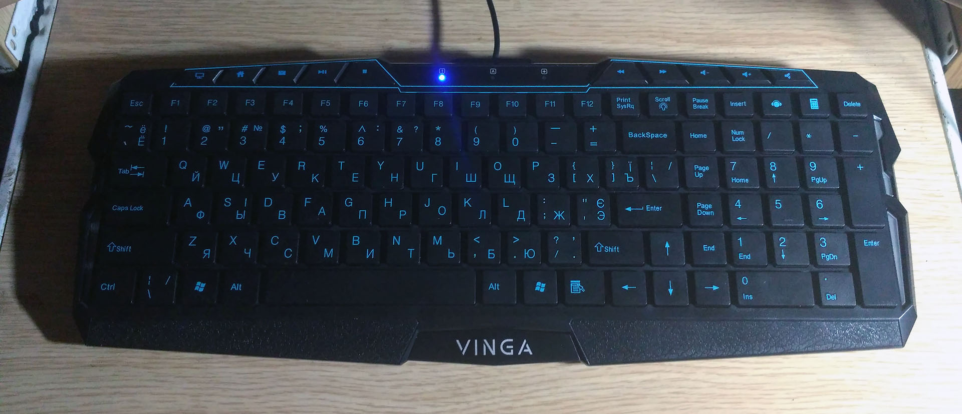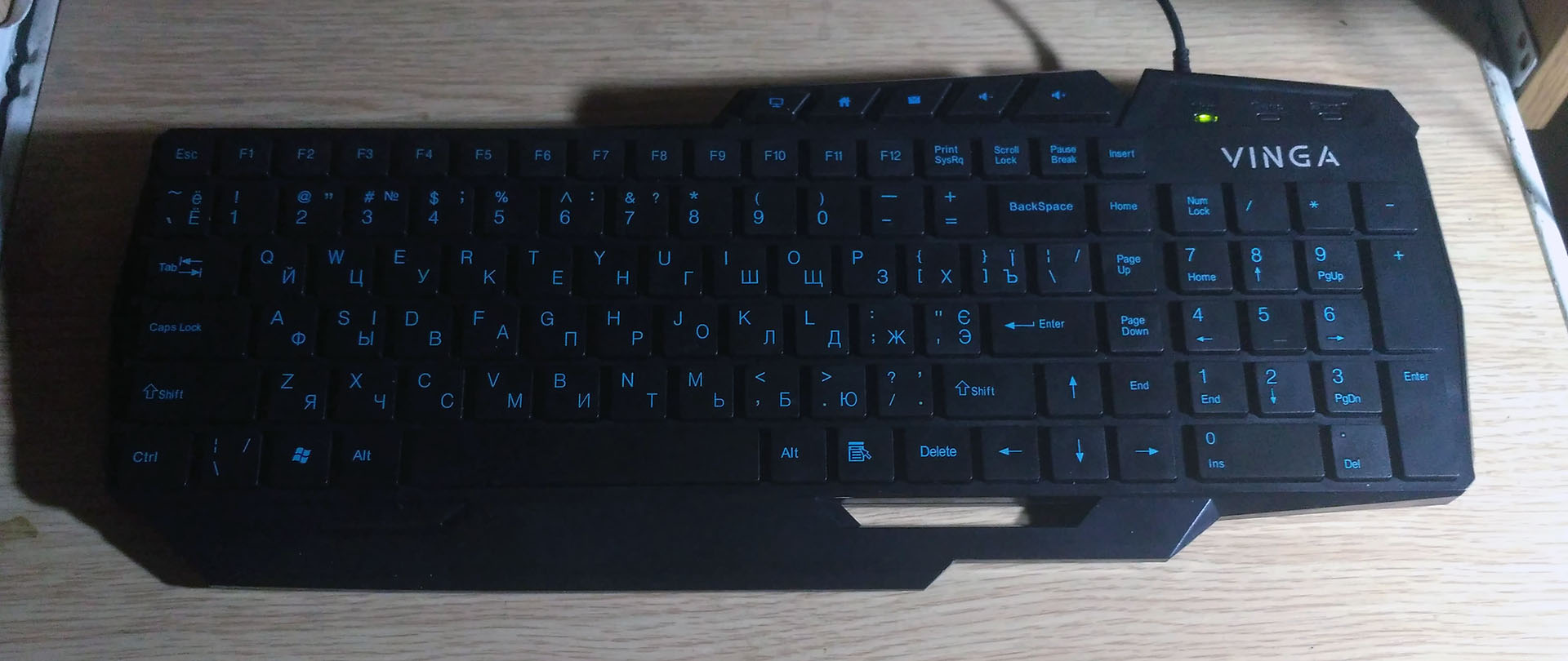 Disappointed in the hope of finding a good backlit keyboard (although at some point I was close to buying the A4 Tech KD-600L or KD-800L, but their price scared me off), I started looking for slim keyboards with multimedia. And almost immediately, I found two very interesting options from Vinga at the top. Their unusual design caught my attention: one was asymmetrical, with intricate carved lines, and the other was more traditional in shape but with a block of LEDs (Num, Caps, and Scroll) in the center and two multimedia islands on either side. Both keyboards had a familiar layout and numeric block but in a compact design (where the Home, End, Insert, Delete, PgUp, and PgDn keys are arranged in a line or scattered around Enter, Backspace, and arrow keys to save space), with low keys and letters in a pleasant blue shade. I immediately liked the color, even though there was no color separation of layouts (like what we're used to seeing on most keyboards: red/gray, white/green/orange, etc.). It remains a mystery to me why blue is mainly used for secondary symbols or action pictograms performed by pressing the Fn key. What surprised me even more was that both keyboards were of the island type, meaning each key was standalone and didn't share free space with others. The island design is often seen in laptops and ultrabooks and is considered the domain of more expensive keyboards (probably due to its convenience, practicality, and slightly higher durability). However, in practice, these advantages can be hard to trace because keyboards usually become boring faster than anything happens to them. Nevertheless, the island design in inexpensive models is a delight.