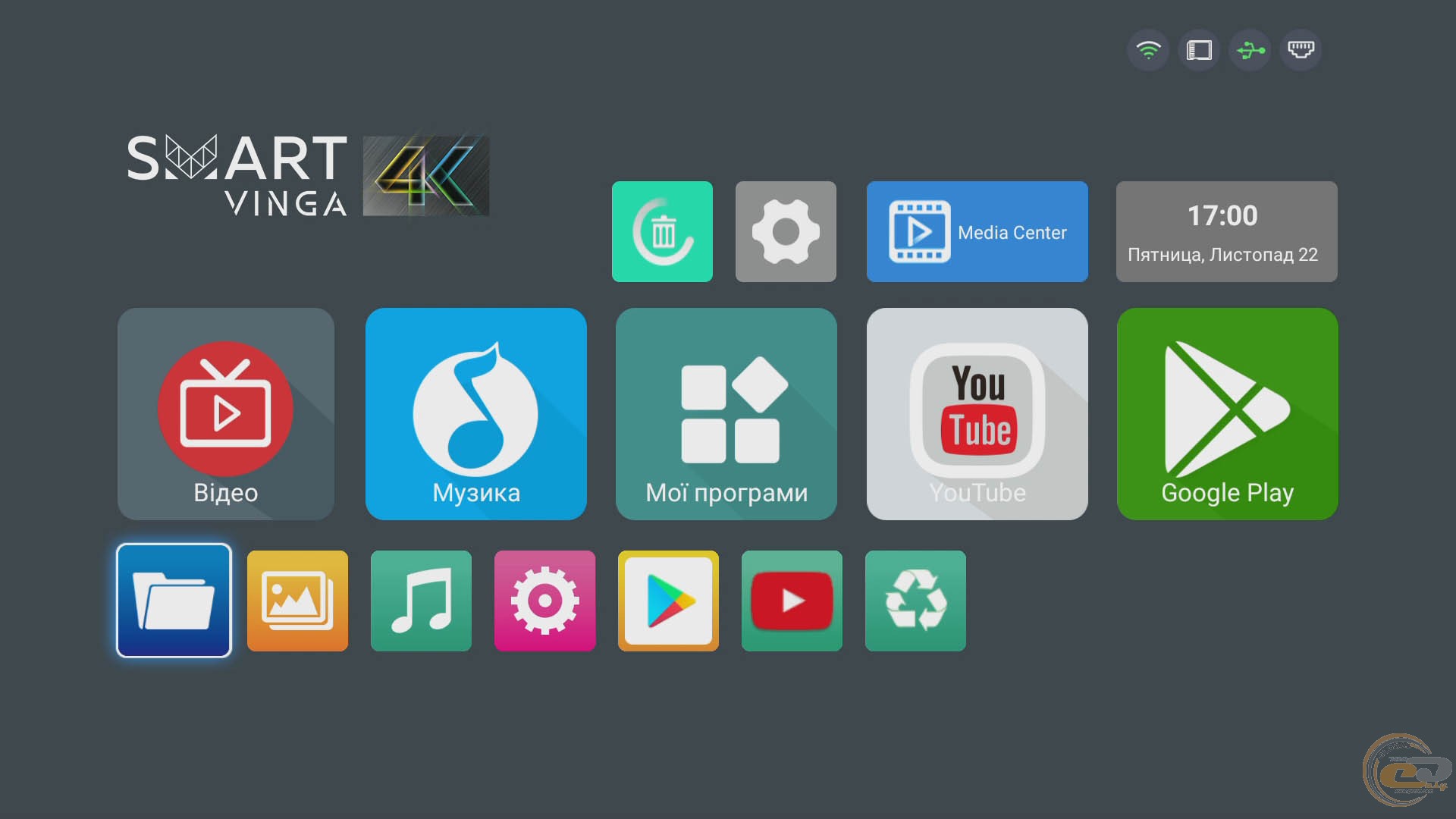 Як і у інших розглянутих раніше медіаплеєрів Vinga, є попередньо встановлена оболонка KODI для управління мультимедійними файлами. Що ж стосується встановлення додаткового софту, то його можна без проблем завантажити з магазину Google Play або APK-файлами з яких зовнішніх пристроїв або по мережі.