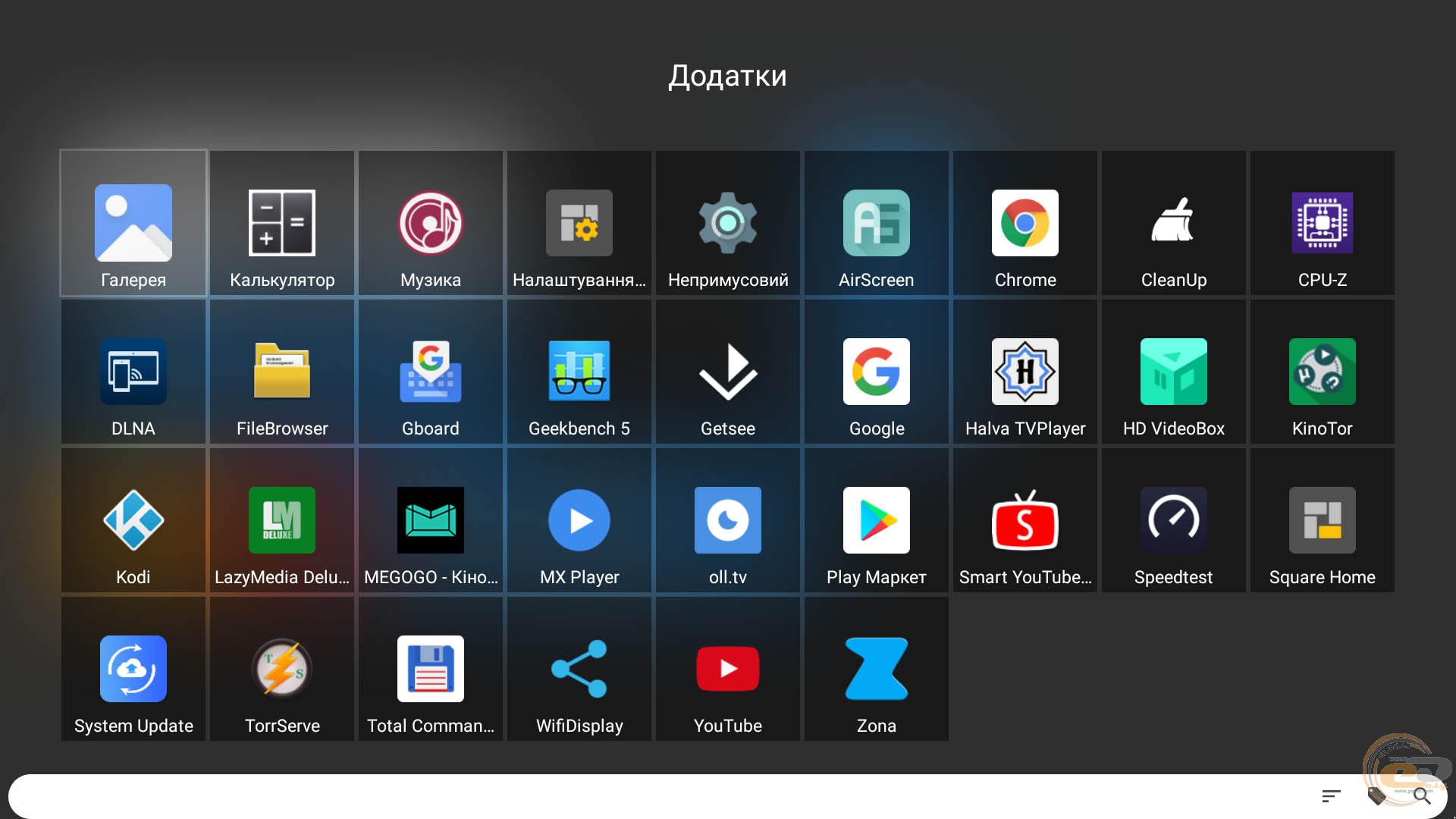 За традицією не обійшлося і без кількох встановлених програм. Наприклад, відразу з коробки є кілька сервісів для перегляду онлайн-відео: LazyMedia, OLL.TV, MEGOGO, HD VideoBox і додатки для IP-TV. Для перегляду відеофайлів традиційно використовується MX Player. Для аудіо є тільки базовий AOSP-додаток - при бажанні можна встановити додаткові програвачі або слухати музику онлайн.