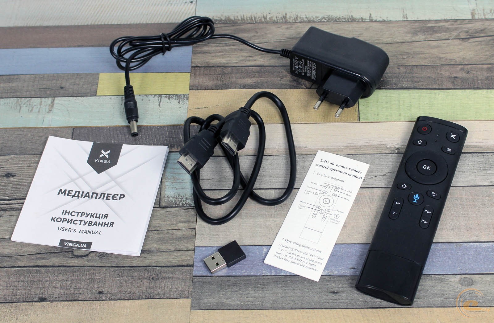 У коробці ми виявили коротку інструкцію, блок живлення, кабель HDMI і компактний пульт управління з USB-приймачем.