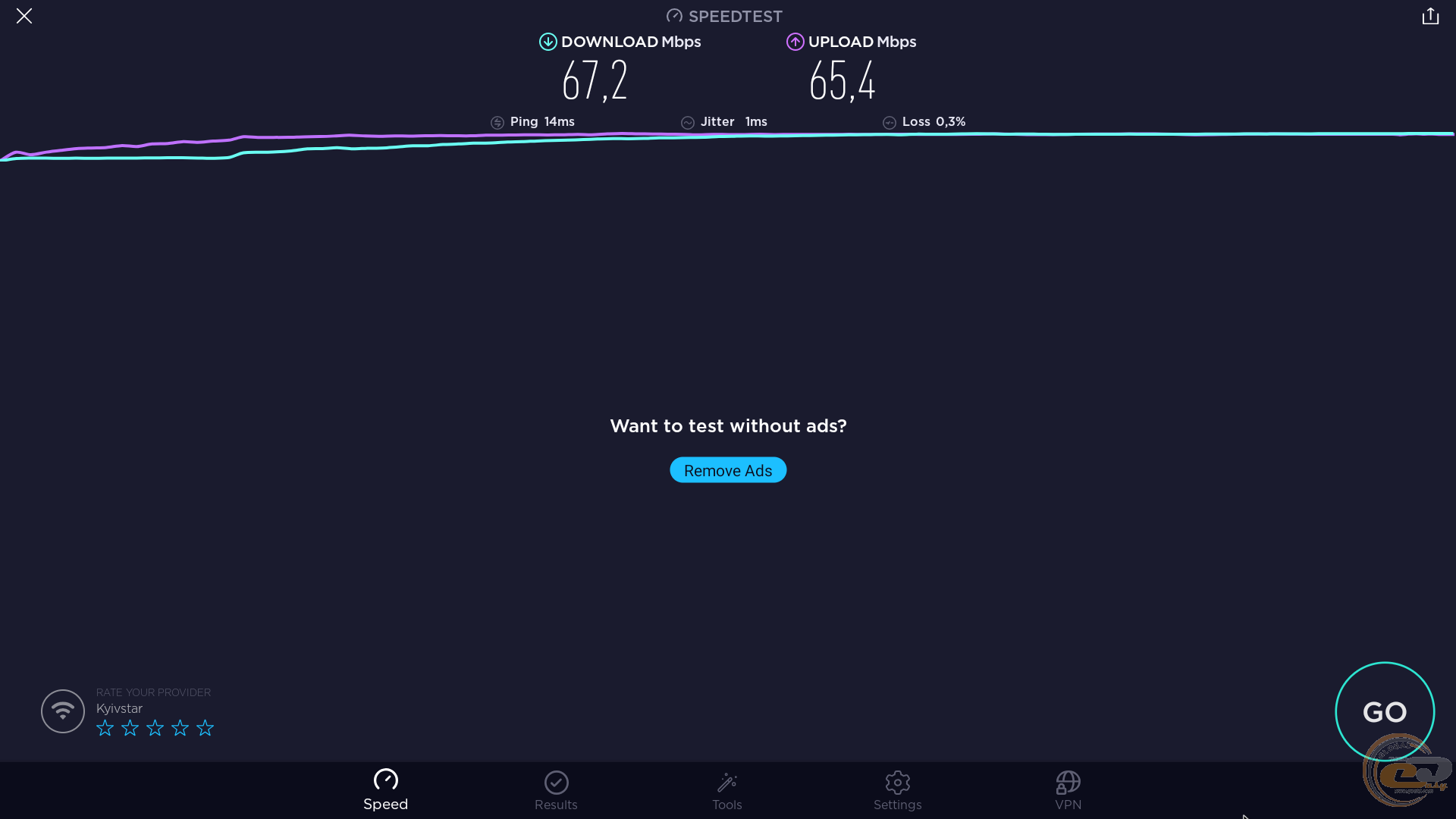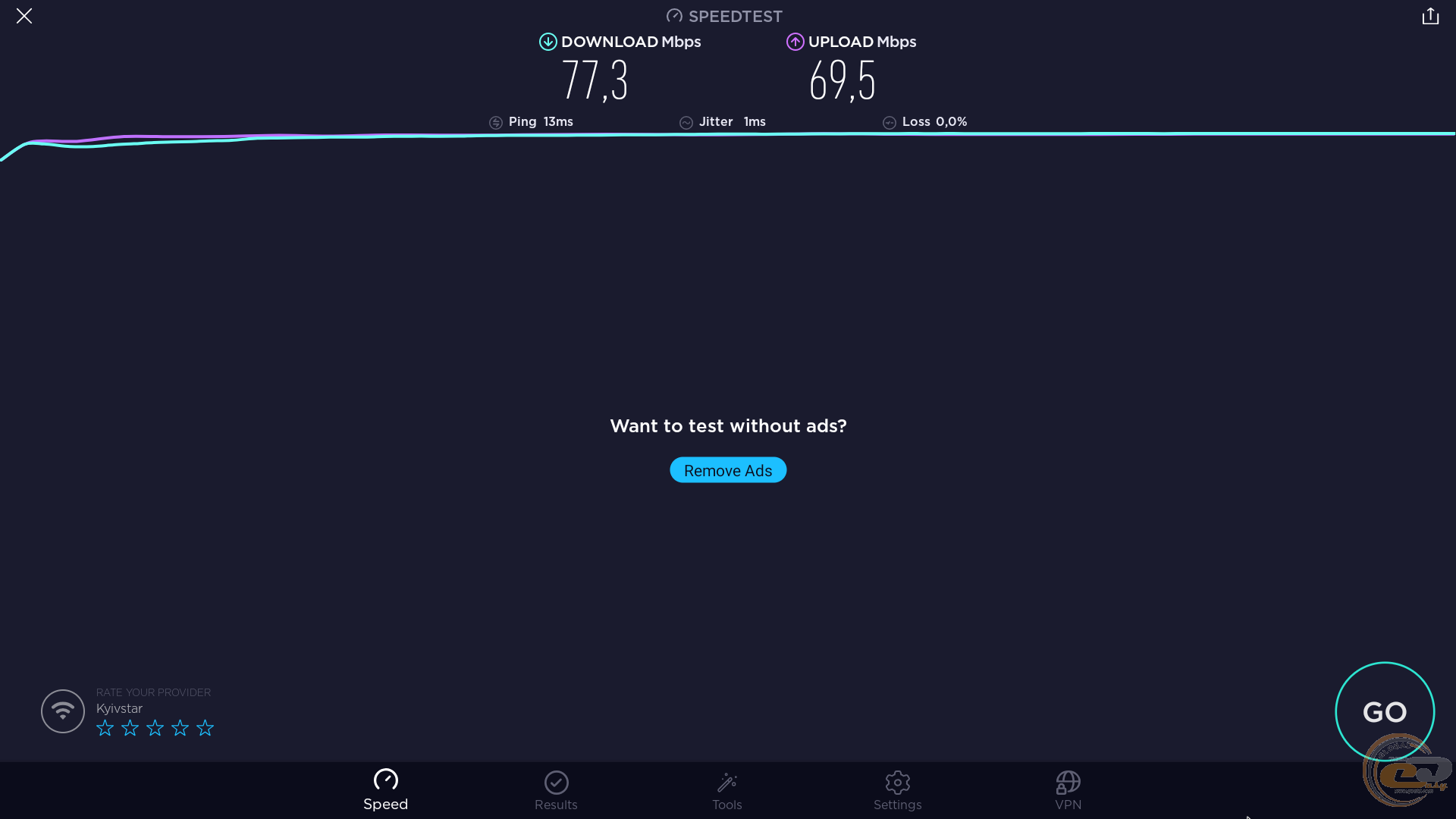 При дротовому підключенні результат був найкращим. Швидкість прийому і передачі склала 77,3 і 69,5 Мбіт/с. І все це при ширині інтернет-каналу 100 Мбіт/с.