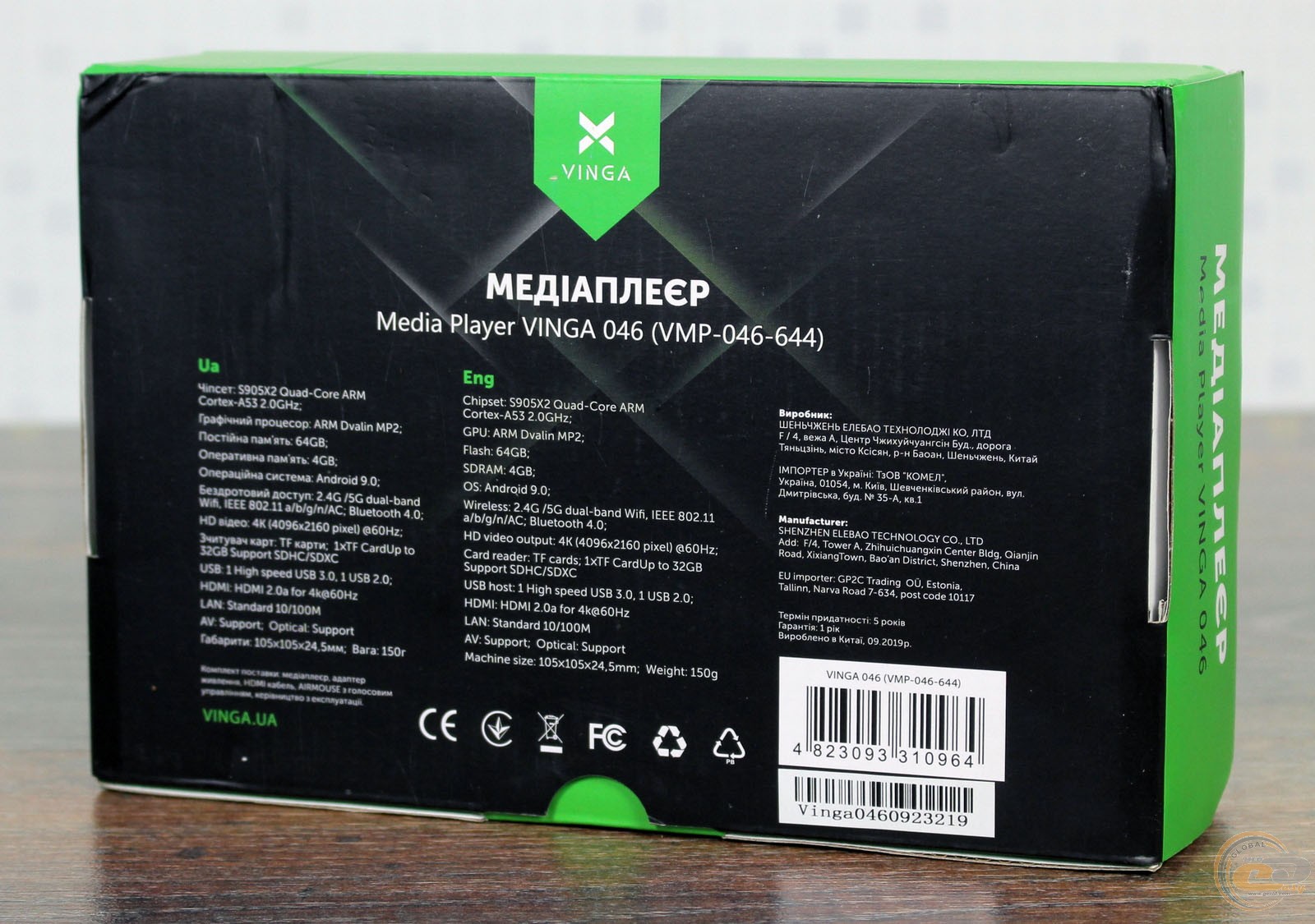Цього разу оцінимо можливості флагманського медіаплеєра Vinga 046, створеного на основі процесора Amlogic S905X2, анонсованого наприкінці 2018 року. Він містить у собі чотири обчислювальних ядра ARM Cortex A53 із частотою до 2 ГГц і двоядерний графічний прискорювач Mali-G31 MP2 з частотою 650 МГц. Відмінною рисою S905X2 є підтримка HDR10+, Dolby Vision, OpenGL ES 3.2 і кодеків H.264, 265 і VP9.