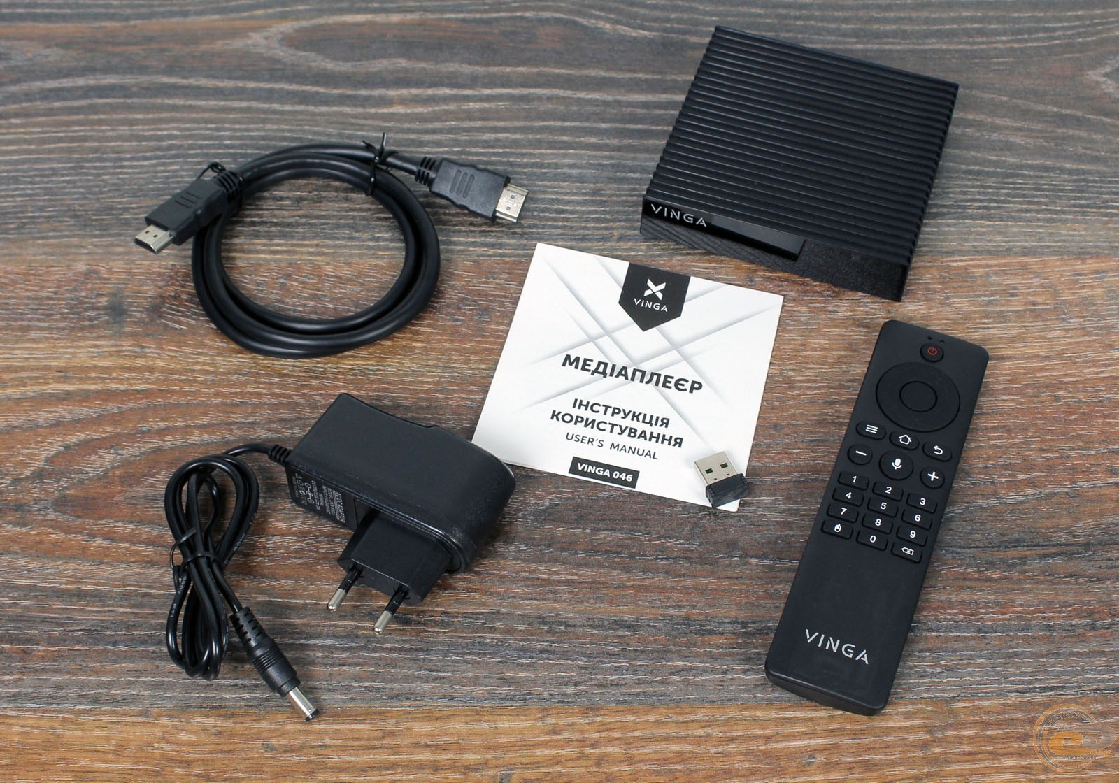 Модель Vinga 046 отримала новий пульт. Він позбавлений Qwerty-клавіатури, але придбав цифрову. Корпус виконаний із матового пластика і відрізняється високою якістю збірки. Будь-які люфти і скрипи відсутні. Він має вбудований гіроскоп, тому без проблем виконує роль мишки. Для активації цього режиму є окрема кнопка зліва від «0». Також є функція Google Assistant і голосовий пошук.