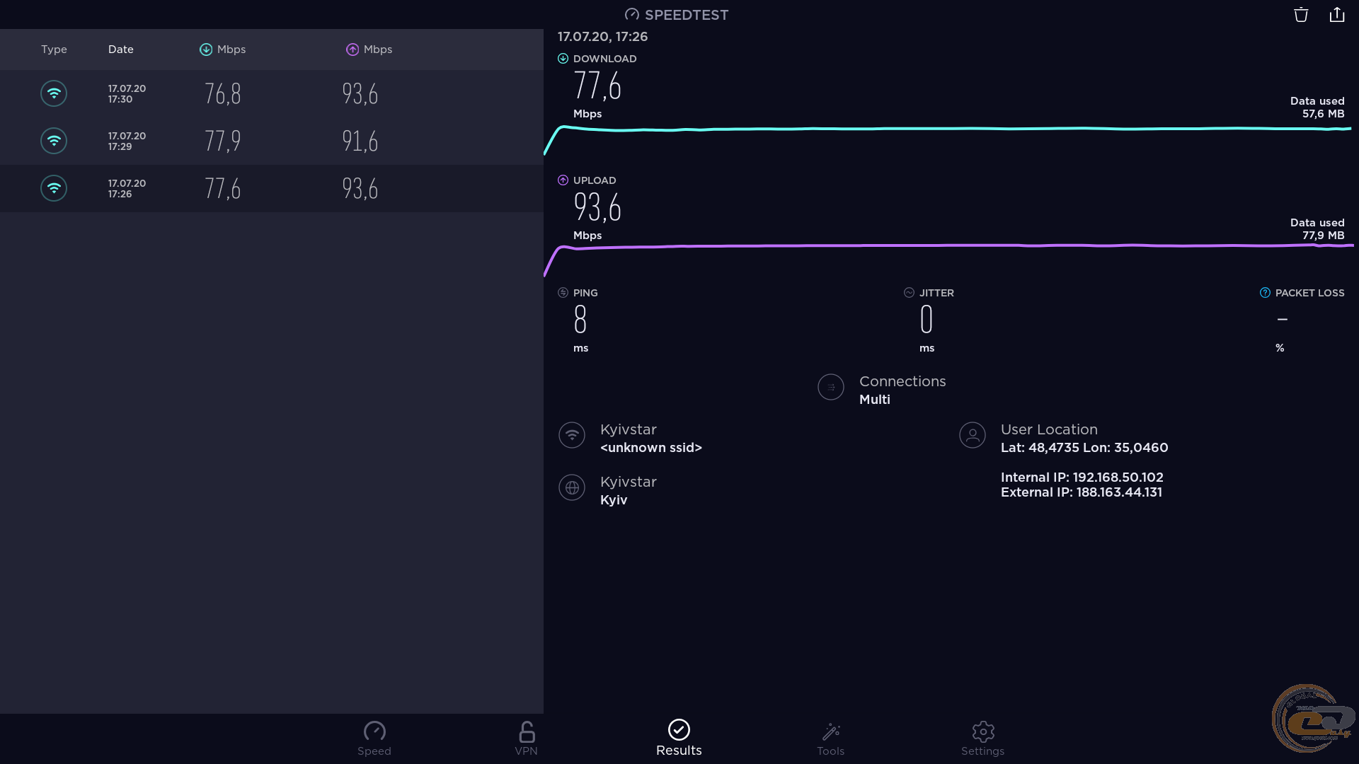 При дротовому підключенні результат був ще вищий: швидкість прийому і передачі склала 93,5 і 93,8 Мбіт/с. І все це при ширині інтернет-каналу 100 Мбіт/с.