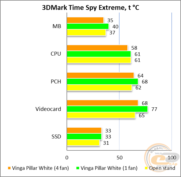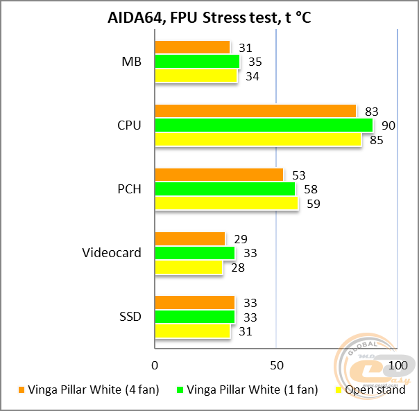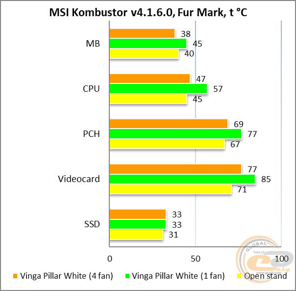 Ситуація кардинально змінюється в кращий бік при використанні чотирьох вентиляторів всередині Vinga Pillar White. У деяких режимах температура окремих вузлів навіть на кілька градусів нижче, ніж у відкритому стенді.
