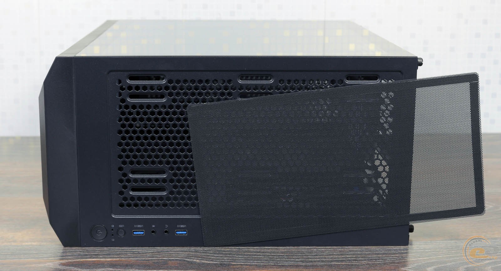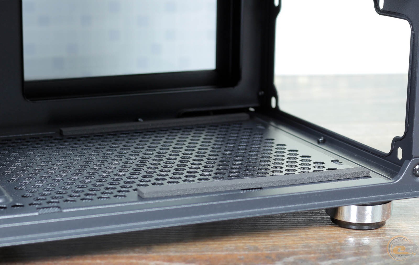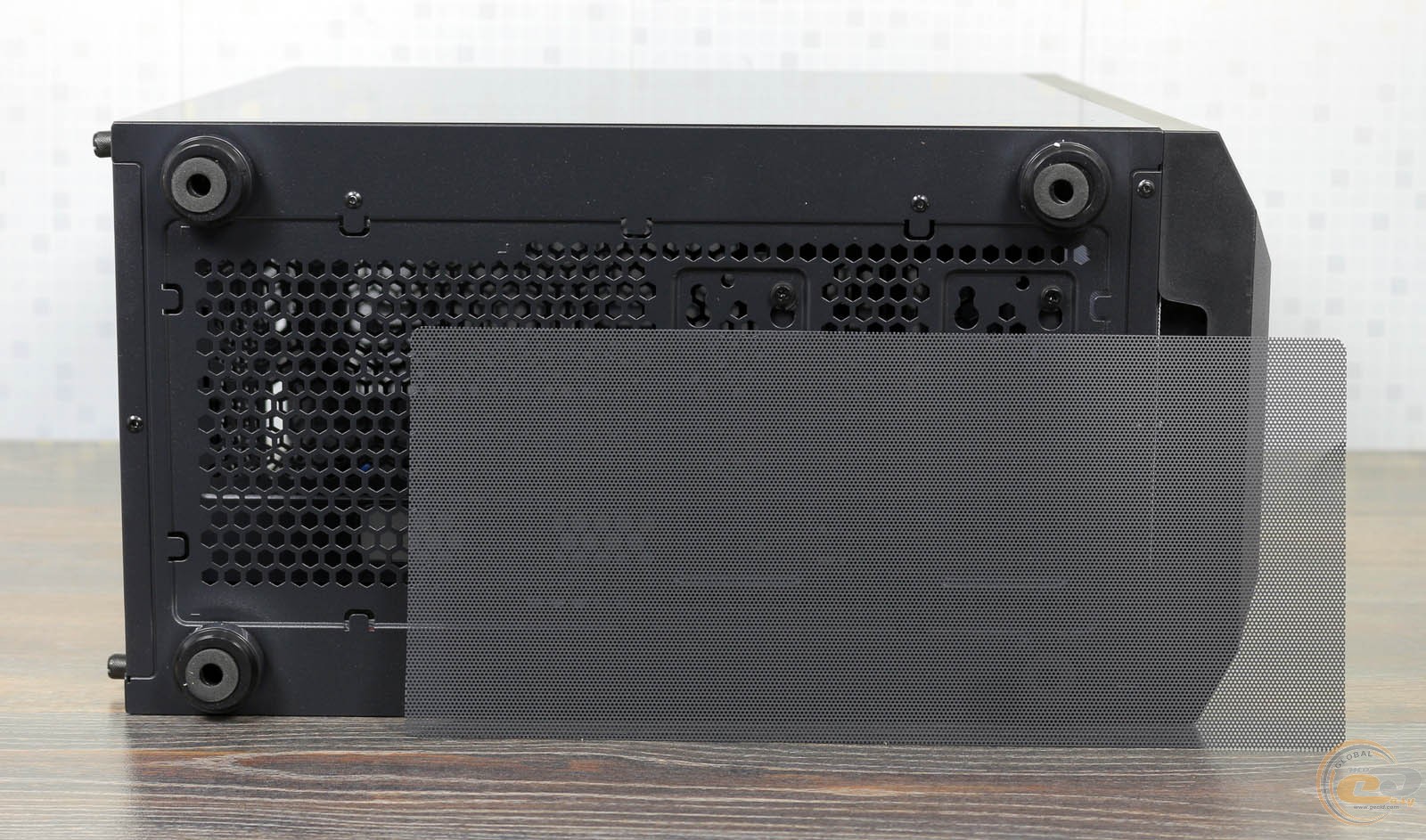 На дні корпуса знаходиться кріплення кошика з накопичувачами і вентиляційний отвір для доступу холодного повітря до БЖ. Усі вони прикриті великим пиловим фільтром. Він легко знімається, продувається і миється.