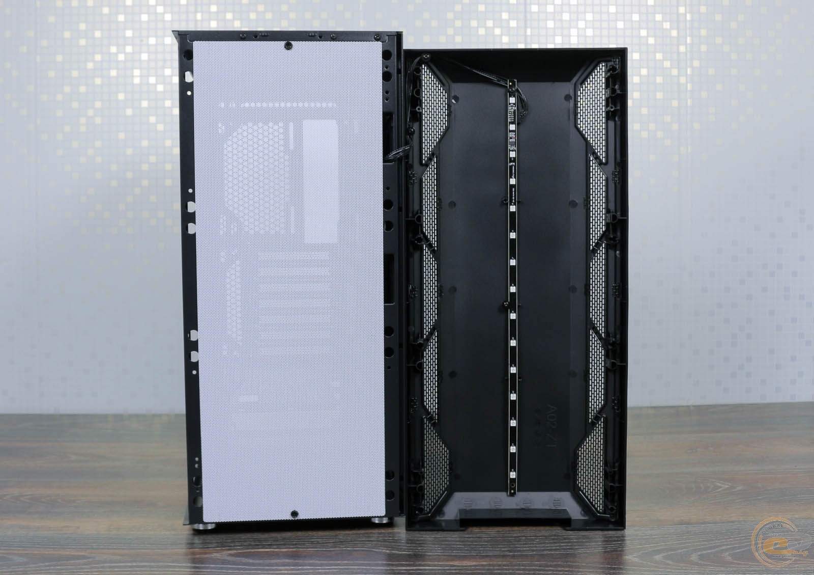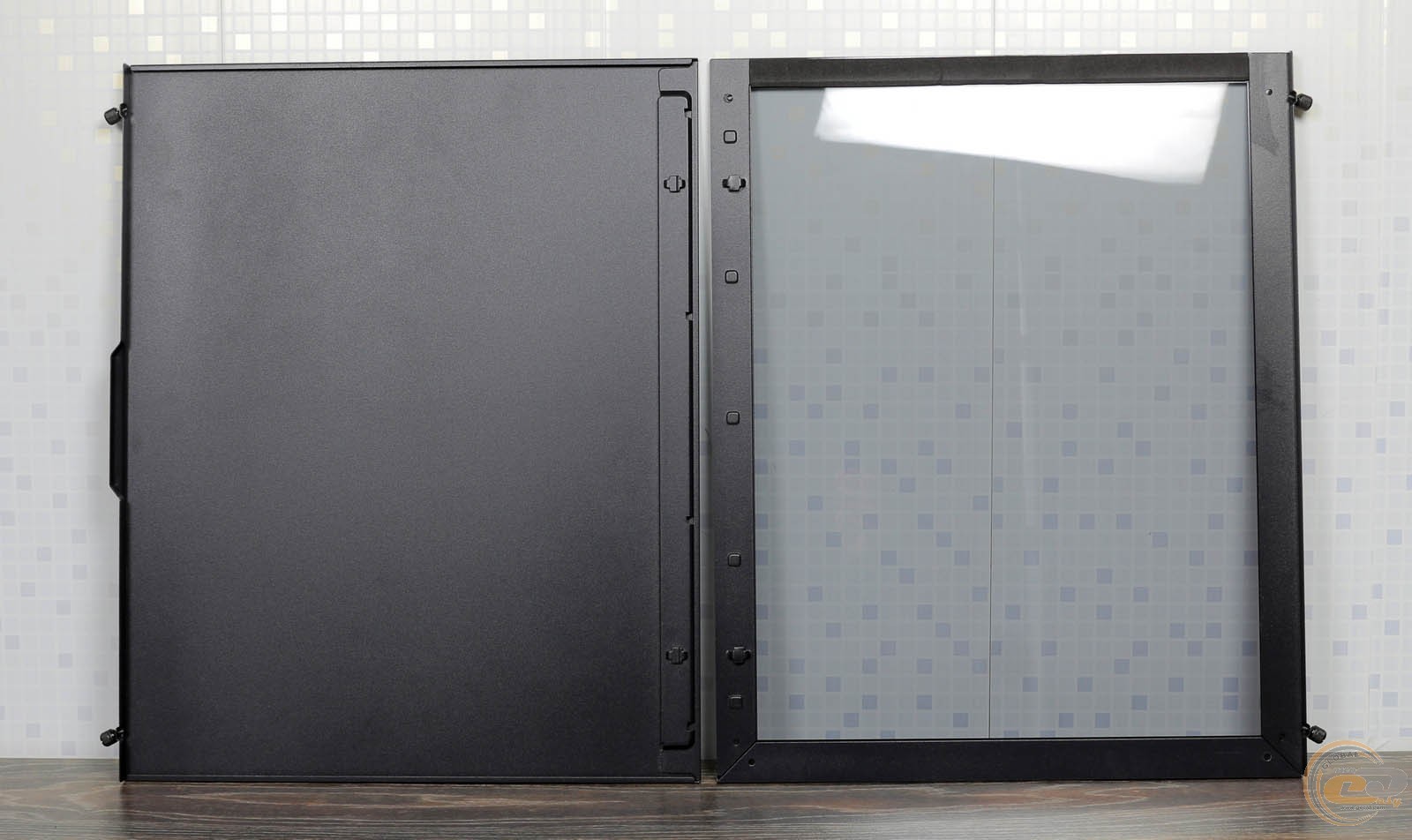 Ліва боковина представлена прозорою скляною панеллю (370 х 463 мм) товщиною 3,87 мм. Вона дозволяє милуватися внутрішніми компонентами. Тримається вона на двох металевих гвинтах з накатаною головкою. До слова, гвинти не випадають після викручування, і ви їх точно не втратите.