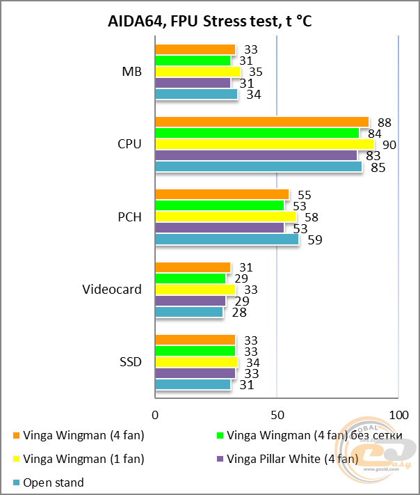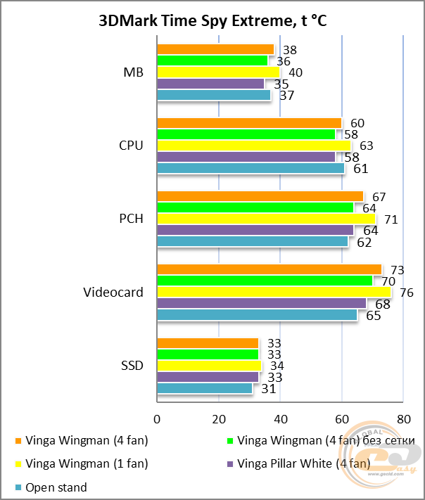 Ситуація кардинально змінюється в кращий бік при використанні чотирьох вентиляторів всередині. Ще краще вона стає, якщо зняти білу сітку, встановлену за фронтальною панеллю. У такому режимі показники Vinga Wingman впритул наближаються до результатів Vinga Pillar White, у якого фронтальна панель має кращу продувності за рахунок відсутності додаткової сітки.