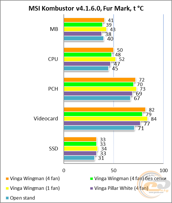 При максимальному навантаженні в MSI Kombustor найбільша різниця між відкритим стендом і корпусом з одним вентилятором досягла 13°С для відеокарти, 7°С для процесора і 6°С для чіпсета. Тобто одного вентилятора явно мало для такої потужної ігрової системи.