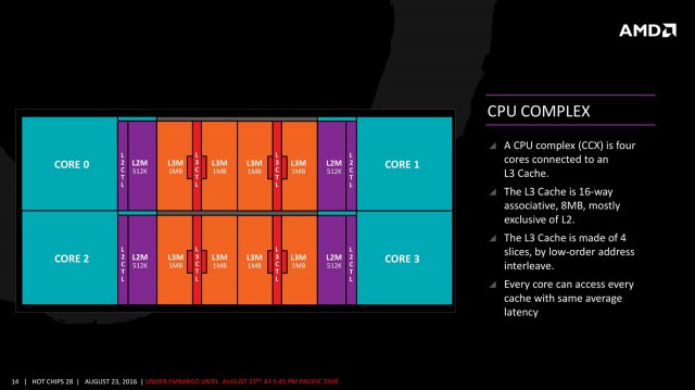 В основі будь-якого процесора з мікроархітектурою AMD Zen знаходиться модуль CPU Complex (CCX). Він містить чотири процесорних ядра, кожне з яких має 512 КБ кеш-пам'яті L2. В свою чергу кеш-пам'ять L3 розділена на вісім частин (по 1 МБ), і доступ до неї мають усі ядра. Відповідно, 8-ядерні процесори виходять шляхом інтеграції в одному корпусі двох модулів CCX, тому вони пропонують 4 МБ кеш-пам'яті L2 і 16 МБ L3. 6-ядерні процесори також виходять з об'єднання двох модулів CCX, але в них два ядра відключені, тому кеш-пам'яті L2 буде всього 3 МБ, а L3 – ті ж 16 МБ. Якщо ж з'являться 2-ядерні моделі, вони матимуть 1 МБ кеш-пам'яті L2 і 8 МБ L3.