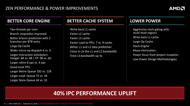Загалом мікроархітектура AMD Zen обіцяє більш ніж 40% приріст показника IPC (Instruction Per Clock). Ось лише невеликий список поліпшень, які реалізували інженери AMD для отримання цього показника: