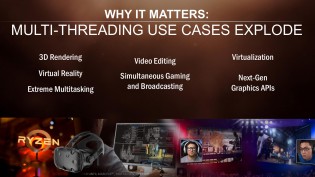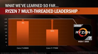 Напередодні дебюту серії Ryzen 7 компанія AMD влаштувала спеціальний брифінг для преси, на якому повідомила деякі цікаві подробиці, які варті уваги. В першу чергу було зроблено акцент на відмінній багатопотоковій продуктивності нових CPU. Зокрема, флагман серії AMD Ryzen 7 1800X на 9% випередив Intel Core i7-6900K і виявився на 66% кращим Intel Core i7-7700K. Зараз багатопотоковість активно використовується при 3D-рендерингу, VR, обробці відео, віртуалізації, стрімінгу ігор тощо.