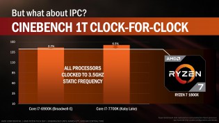 Що ж стосується продуктивності в однопотоковому режимі, при однаковій тактовій частоті (3,5 ГГц) обидва конкурента від Intel вириваються вперед: на 2,7% і 6,5% відповідно. Якщо порівнювати їх показники при стокових частотах, Intel Core i7-6900K знаходиться на рівні AMD Ryzen 7 1800X, а Intel Core i7-7700K виривається вперед на 15%. Цікаво, що компанія AMD не стала ховати такі результати, а зіграла на випередження незалежних оглядів і чесно вказала сильні та слабкі сторони AMD Ryzen.