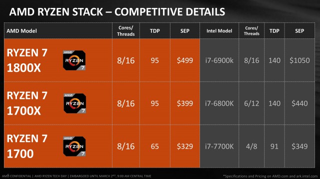 Загалом AMD визначила конкурентів для своїх перших процесорів: AMD Ryzen 7 1800X ($499) протистоїть Intel Core i7-6900K ($1089 – 1109), AMD Ryzen 7 1700X ($399) спробує відібрати покупців у Intel Core i7-6800K ($434 – 441 ), а AMD Ryzen 7 1700 ($349) доведеться битися з Intel Core i7-7700K ($339 – 350).