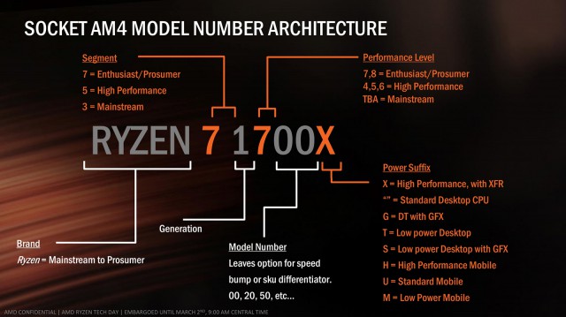 Дуже цікавою виглядає розшифровка назви процесорів лінійки AMD Ryzen. Перша цифра після бренду вказує на сегмент: «7» – рішення для ентузіастів, «5» – високопродуктивні, «3» – мейнстрім-рівень. Наступна цифра означає покоління. Тобто флагманом наступного покоління може бути AMD Ryzen 7 2800X. Далі однією цифрою позначається рівень продуктивності: «7» або «8» – чіпи для ентузіастів, «6», «5» або «4» – високопродуктивні рішення. Мейнстрім-рівень поки не анонсований, тому їх цифри ми дізнаємося пізніше, але згідно з попередньою інформацією, це будуть «1», «2» і «3». Дві останні цифри дозволяють випускати додаткові моделі, які будуть трохи відрізнятися за рівнем продуктивності. Наприклад, можуть з'явитися процесори AMD Ryzen 7 1720X і AMD Ryzen 7 1750X, які за рівнем продуктивності й ціною будуть перебуватимуть між AMD Ryzen 7 1700X і Ryzen 7 1800X. Остання буква вказує на енергоефективність. Наприклад, «X» позначає високопродуктивні чіпи, «G» з'явиться в назві десктопних моделей із вбудованим графічним ядром, «T» вказує на енергоефективні десктопні рішення, а «S» – на енергоефективні десктопні чіпи з вбудованою графікою. Для мобільних аналогів передбачені суфікси «H» (високопродуктивні), «U» (стандартні) та «M» (енергоефективні).