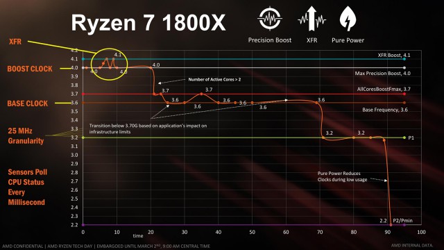На прикладі флагмана AMD Ryzen 7 1800X наочно проілюстровано вплив складових компонентів AMD SenseMI на динамічну зміну тактової частоти процесора. Базова його швидкість становить 3,6 ГГц. У динамічному режимі частота всіх 8 ядер може підніматися лише до 3,7 ГГц у залежності від рівня навантаження. Більше 2 ядер одночасно (але не всі 8) можуть підвищувати свою швидкість до 4,0 ГГц завдяки технології Precision Boost – це заявлений поріг динамічної частоти в характеристиках даної моделі. І лише одне ядро може короткочасно піднімати свою швидкість ще на 100 МГц (до 4,1 ГГц), якщо система охолодження справляється зі зростанням тепловиділення. Це заслуга технології XFR. У свою чергу за зниження частоти для підвищення енергоефективності відповідає технологія Pure Power. Оскільки моніторинг фіксує стан процесора кожну мілісекунду, це дозволяє оперативно змінювати частоту з кроком 25 МГц, що забезпечує максимальну ефективність використання ресурсів CPU.