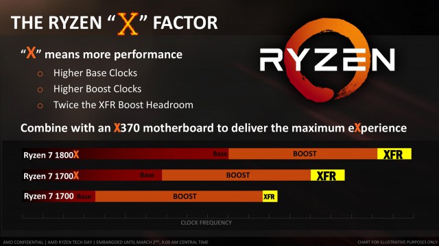 Раніше передбачалося, що наявність суфікса «X» у назві процесора вказує на підтримку технології XFR. Проте це не так. Просто в даних моделей більший показник TDP, що дозволяє збільшити тактові частоти і тепловий коридор для XFR до 100 МГц. У свою чергу модель AMD Ryzen 7 1700 працює при нижчих швидкостях, а за допомогою XFR може піднімати частоту одного ядра лише на 50 МГц вище максимальної динамічної частоти. Це ж буде справедливим і для інших представників лінійки AMD Ryzen.