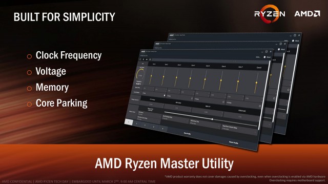 Щоб полегшити оверклокінг CPU лінійки AMD Ryzen створено спеціальну утиліту – AMD Ryzen Master Utility. Вона дозволяє модифікувати частоту окремих ядер, напругу та параметри оперативної пам'яті. Також передбачено декілька профілів для зберігання та швидкої активації оптимальних налаштувань.