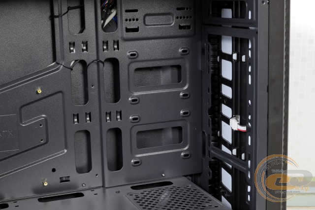 Шасі явно розраховане на пару 5,25" пристроїв, на що вказує наявність відповідних металевих заглушок і кріпильних отворів на піддоні. Однак передня панель не дозволить їх встановити.