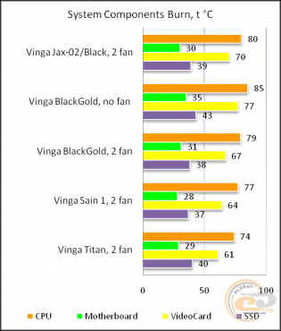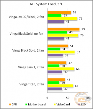Діаграма «All System Load» показує нагрівання компонентів після 30 хвилин 3DMark Fire Strike в режимі Ultra (роздільність 4K). А режим «System Component Burn» демонструє температури при навантаженні додатками AIDA64 (Stress CPU і FPU) і MSI Kombustor протягом 15 хвилин.