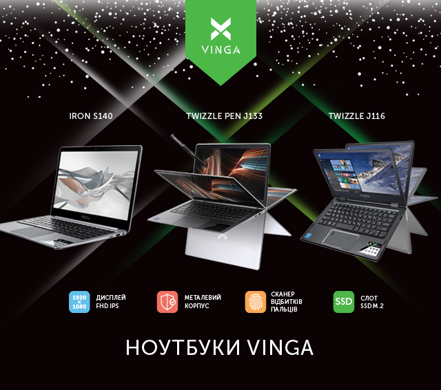 Представлені два модельних ряди ноутбуків: Vinga Twizzle для домашнього використання, і орієнтований на корпоративний сегмент Vinga Iron. Конструктивно лептопи відрізняються один від одного. Якщо останній - це класичний ноутбук, то перший - пристрій «2-в-1» з можливістю розкриття корпусу на 360 градусів, оснащений екраном з тачскріном, а модель Vinga Twizzle Pen ще й чутливим до сили натискання стилусом.