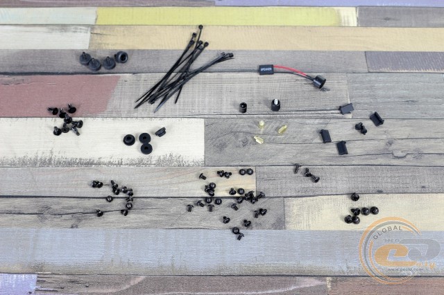 Разом з корпусом ви знайдете різноманітні гвинти, стійки з накидною головкою для їх встановлення, системний динамік, набір стяжок і заглушки для інтерфейсів.