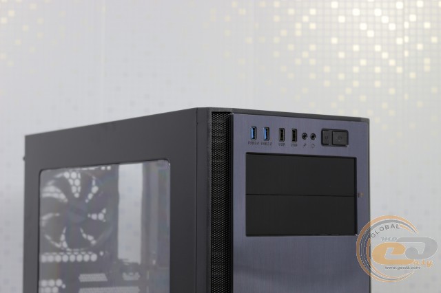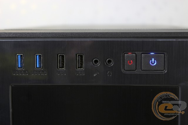 Вгорі є два посадкових місця під зовнішні 5,25" пристрої. Тут же знаходиться по парі портів USB 3.0 і USB 2.0, а також два 3,5-мм роз'єму для мікрофона і навушників. Поруч притулилися кнопки живлення і перезавантаження. У кнопки вмонтовані звичні індикатори.