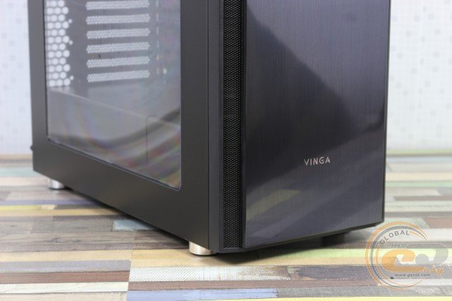 Бічні панелі Vinga Vanguard виконані з листової сталі (товщина з фарбою 0,91 мм). Зліва є акрилове вікно (385 х 365 мм), а праворуч - декоративна перфорація. Вони утримуються зручними гвинтами з пластиковою накатаною головкою. Для полегшення демонтажу передбачена ручка, а для посилення міцності використовуються ребра жорсткості.