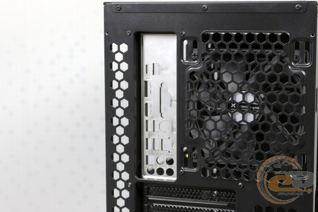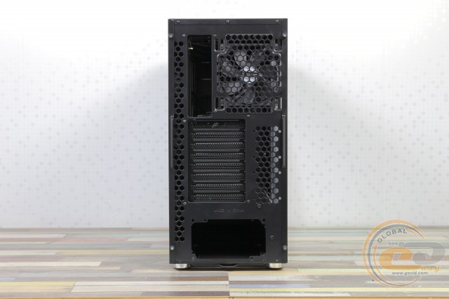 Ззаду корпус має звичну будову з нижнім розміщенням блоку живлення. Над його посадковим місцем знаходяться вісім слотів розширення, виріз для інтерфейсної панелі материнської плати і встановлений пропелер на видув. Завдяки вертикальним прорізам пропелера можна зміщувати вгору або вниз, оптимально налаштовуючи його під повітряний потік процесорного кулера баштової конструкції. Також відзначимо велику кількість перфорації у вигляді сот.