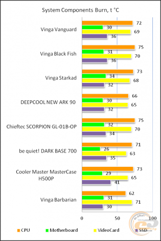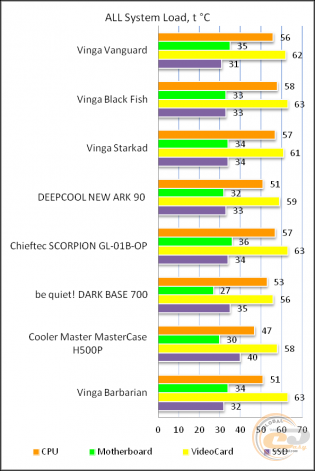 Великий внутрішній простір забезпечує вільну циркуляцію повітря всередині, тому бачимо дуже комфортні температурні показники комплектуючих. Результати можна порівняти з більш дорогим Vinga Starkad. Тобто навіть в стоковому стані на базі Vinga Vanguard можна сміливо збирати продуктивний комп'ютер з однією відеокартою, а з додаванням пари пропелерів - і поготів.