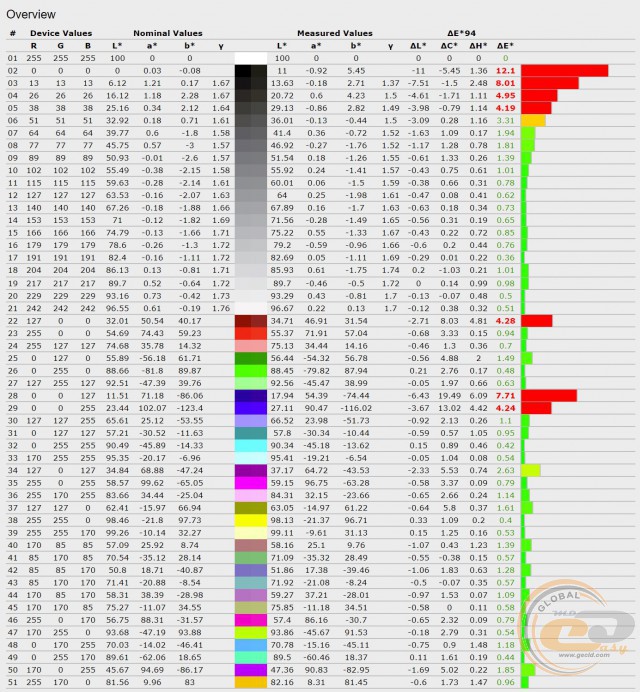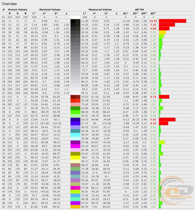 Результати ручного калібрування приємно здивували. В першу чергу вдалося в 35 разів скоротити яскравість чорного поля і підвищити контрастність із 78:1 до 1428:1. По-друге, поліпшено точність передачі всіх кольорів і відтінків. Також гармонізовано гама-криві й середній показник наблизився до еталонних 2,2. Як бачимо, в основі телевізора використовується доволі якісна панель, можливості якої не були розкриті заводським калібруванням. Тому після покупки рекомендуємо за можливості провести ручне налаштування параметрів.