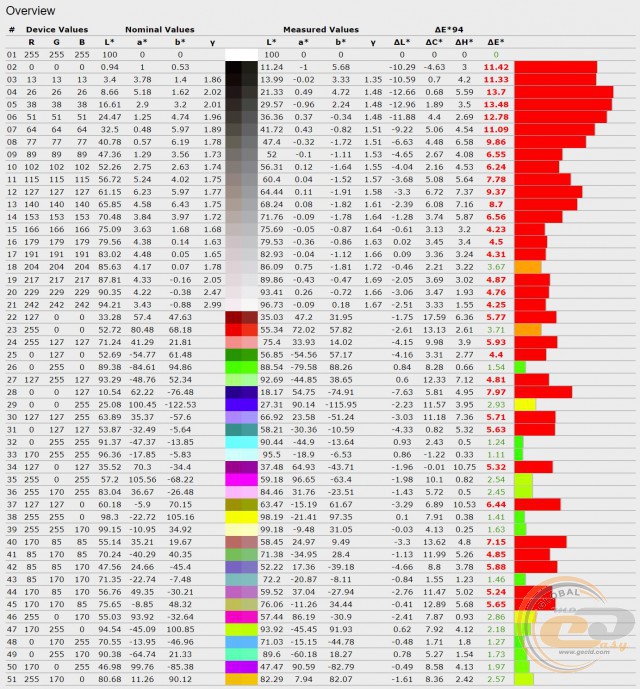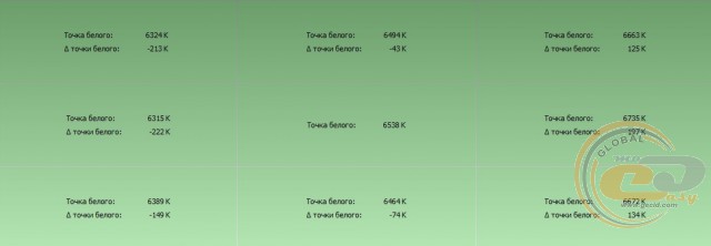 У плані точності передачі відтінків жоден профіль не зміг вписатися в необхідні критерії. Тобто середнє і максимальне відхилення ΔE були вище 1,5 і 4 відповідно. Гірше за всіх впорався з тестом профіль «Стандартний». В інших ситуація не настільки лякає, але все одно 6-7 відтінків відкалібровані невірно.