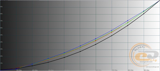 Налаштування гама-кривих у всіх випадках вийшло практично однаковим: вони перебувають трохи вище еталонної чорної лінії. Це може стати причиною пересвічування напівтонів і втрати деталей на світлих ділянках зображення.