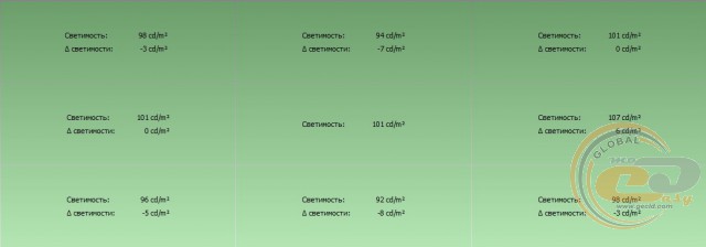 Максимальне відхилення яскравості щодо центральної ділянки не перевищує 8 кд/м2, що можна вважати відмінним результатом.