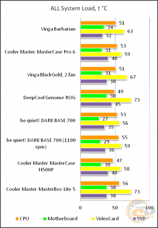 Even though the three front fans have virtually nowhere to draw cool air, the Vinga Barbarian case shows very decent results. Not record-breaking, but it doesn't fall "face down in the dirt" even against much more expensive and renowned competitors. True, the latter can still install additional fans and improve the situation, whereas here this is practically the maximum. As for acoustic comfort, we had no complaints.