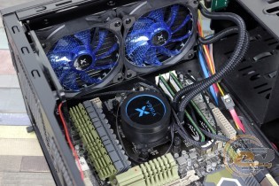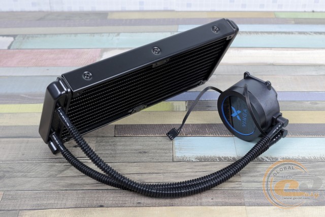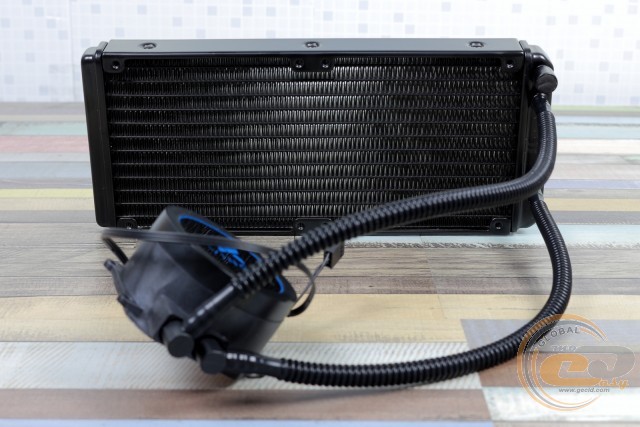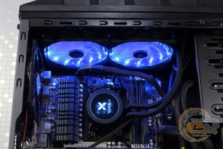 Хоча перед нами середньостатистичний представник водянок без можливості обслуговування, але варто лишень включити комп'ютер, як м'яке синє LED-підсвічування пропелерів і водоблока кардинально змінює зовнішність системника. Якщо боковина корпуса обладнана прозорим вікном, тоді власнику «тайфуна» однозначно буде чим милуватися.